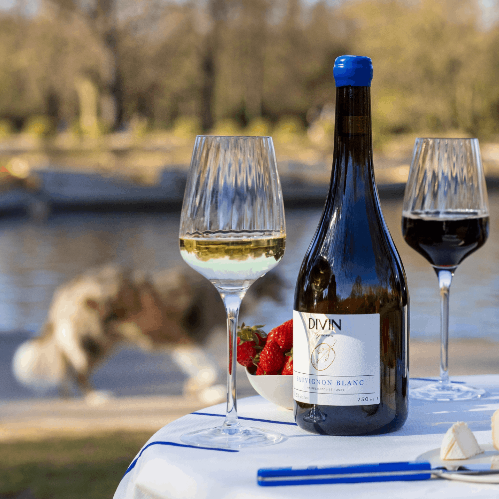 Divin Vigneron low-alcohol Sauvignon Blanc is produced in the Loire Valley from parcels of old vines, offering a low-alcohol white wine alternative with depth and precision. Part of the blend is matured in stainless-steel vats to preserve freshness, while another portion rests for ten months in oak barrels, bringing layered aromas and structure
