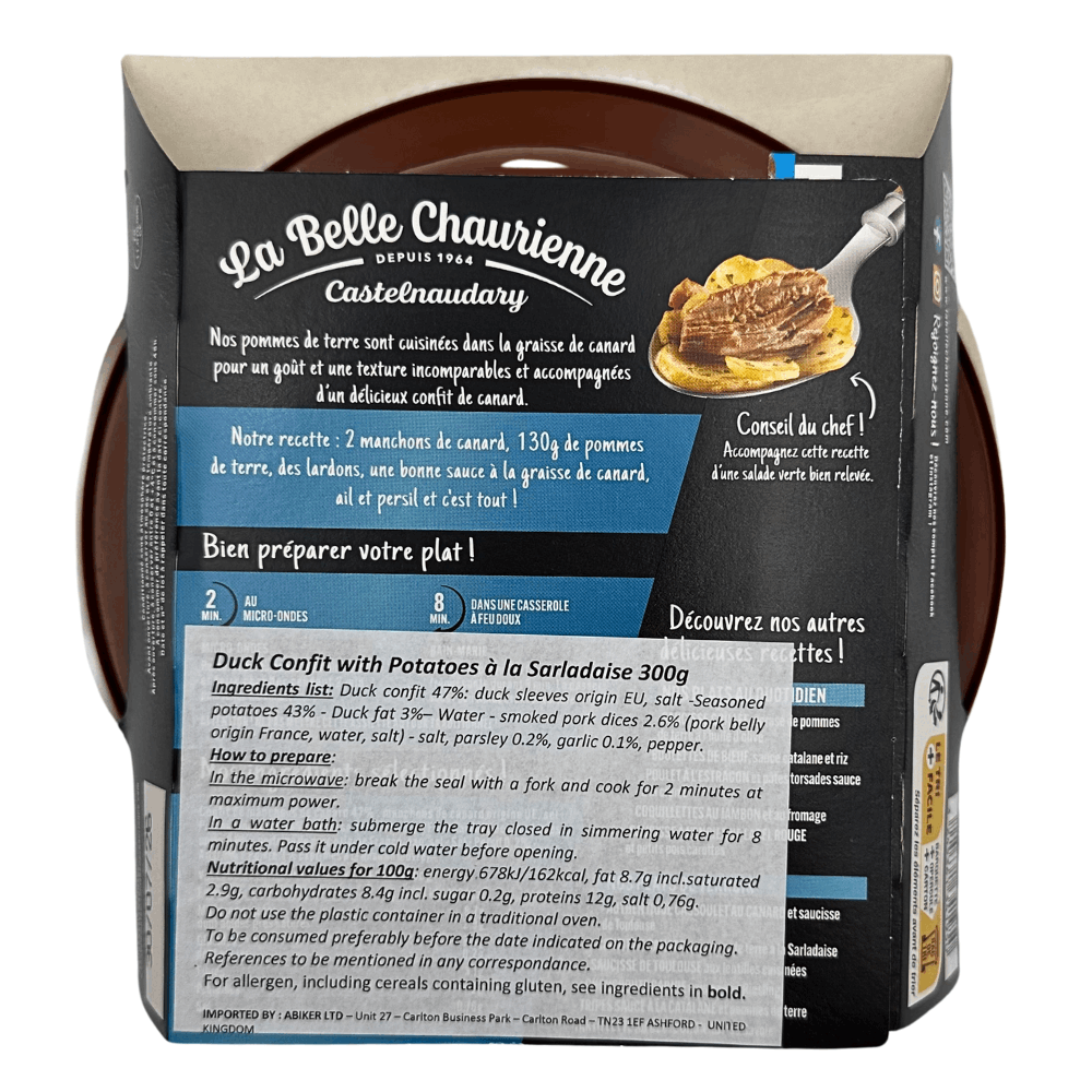 Confit duck is a staple of traditional French cooking. This ready meal combines authentic French duck confit with sarladaise potatoes (cooked in duck fat) and bacon lardons for that bit of extra flavour.