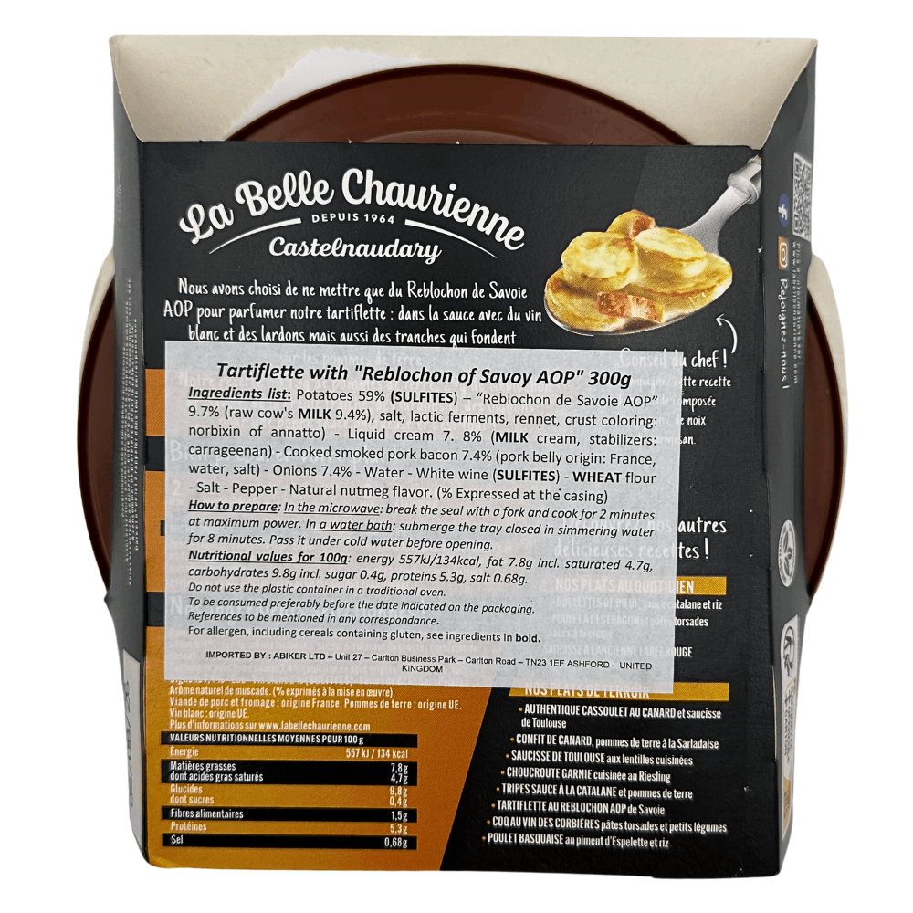 Ingredients – potatoes 59% (potatoes, sodium sulfite (E223)), “Reblochon of Savoy AOP” in slices 10% (raw cow MILK 9.4%, salt, lactic ferments, rennet, crust colour, annatto norbixin), liquid cream (MILK cream, stabilizers: carrageenans), smoked pork bacon 7% (pork breast from France, water, salt), onions 7%, water, white wine, WHEAT flour, salt, pepper, nutmeg flavouring.