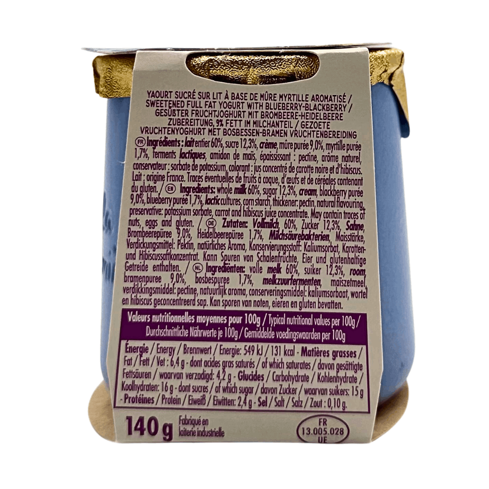 Ingredients: WHOLE MILK, CREAM , sugar 8.8%, blackberry 8% (puree), blueberry 2% (puree), corn starch, lemon (juice), thickener: pectin, natural flavour, LACTIC FERMENTS , preservative: potassium sorbate, carrot and hibiscus (juice concentrate).