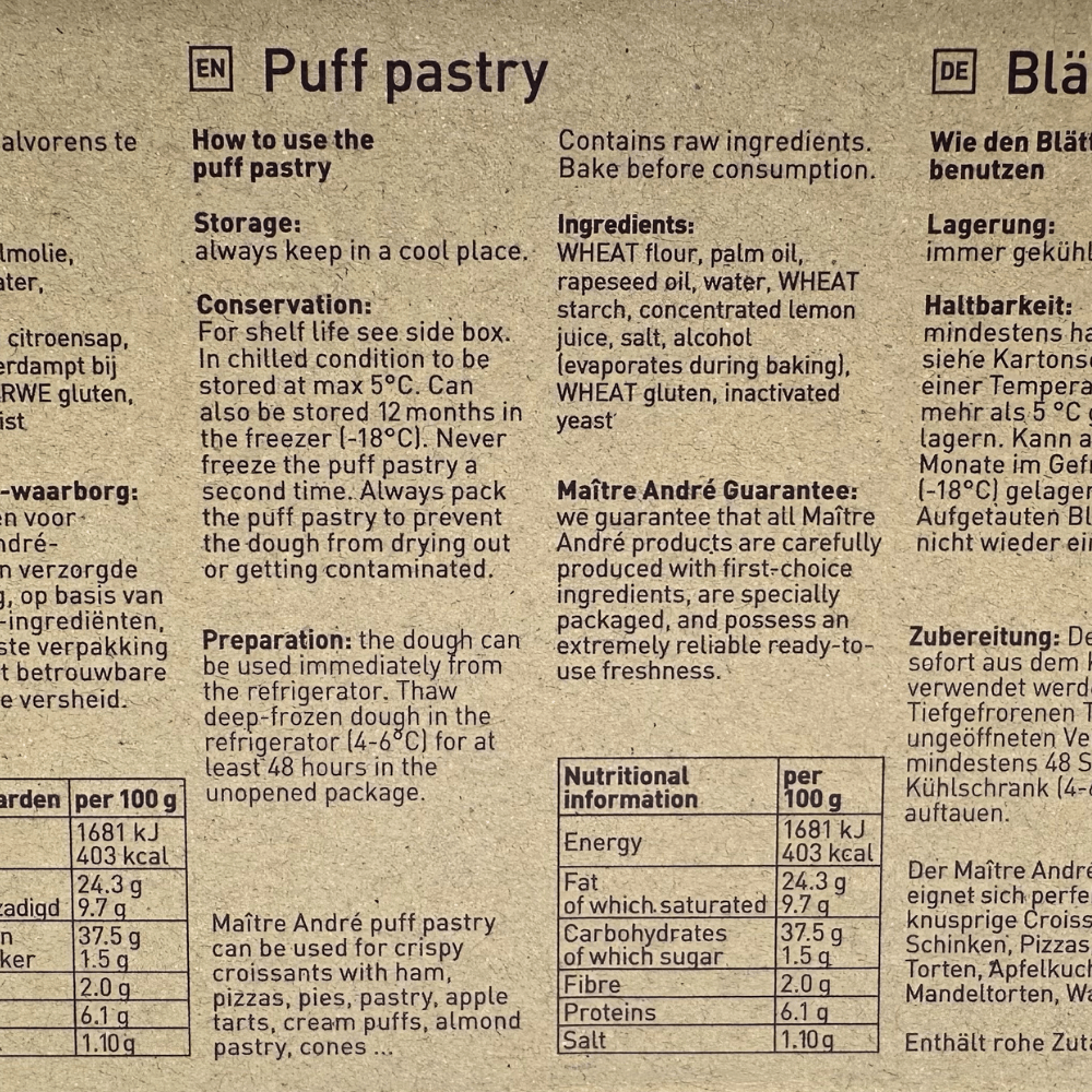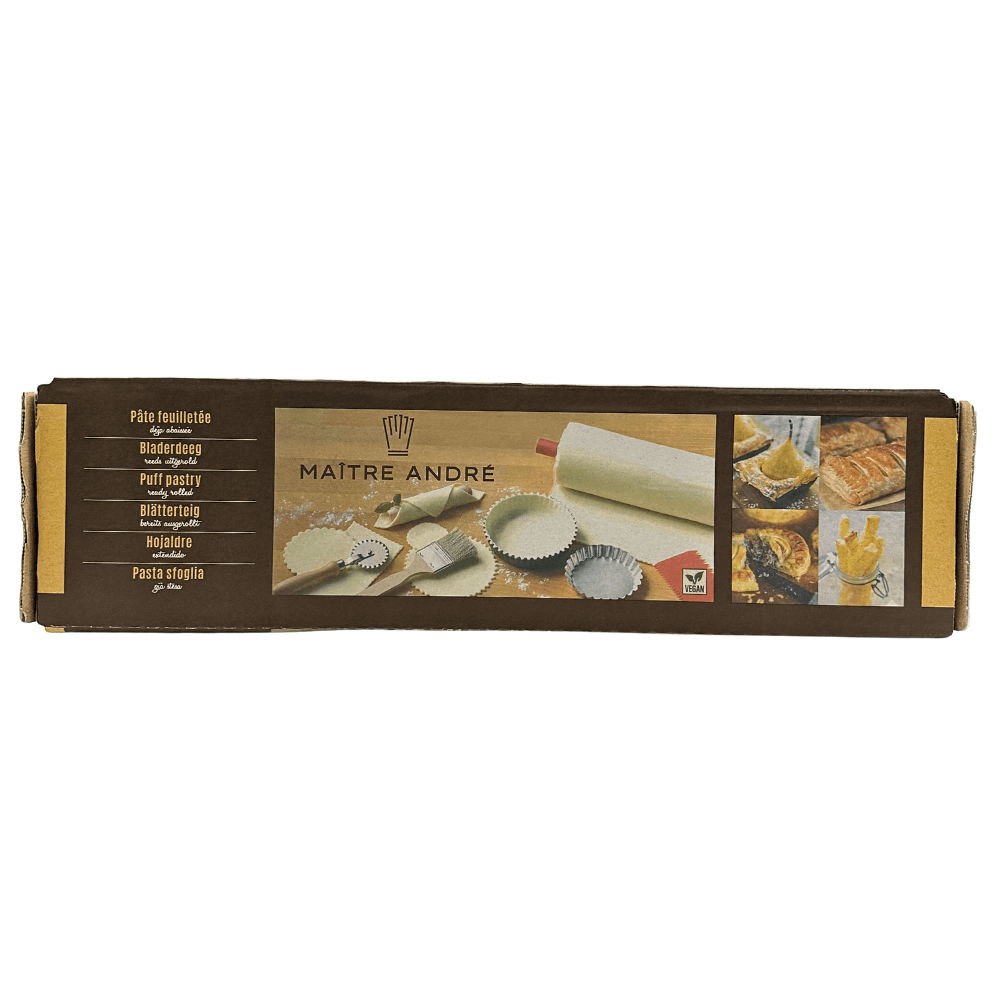 Create a wide range of baked goods with this puff pastry, including pastries, Danishes, tarts, pies, and various appetisers. The many layers in puff pastry rise and separate during baking, creating a light, airy, and flaky texture. Maitre Andre vegan puff pastry roll 4.25kg is perfect for catering business. Its convenient, ready rolled format will provide for large gatherings and baking events.