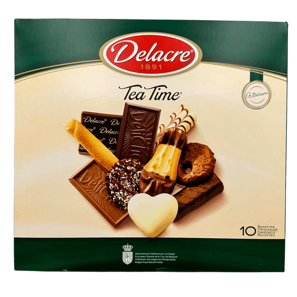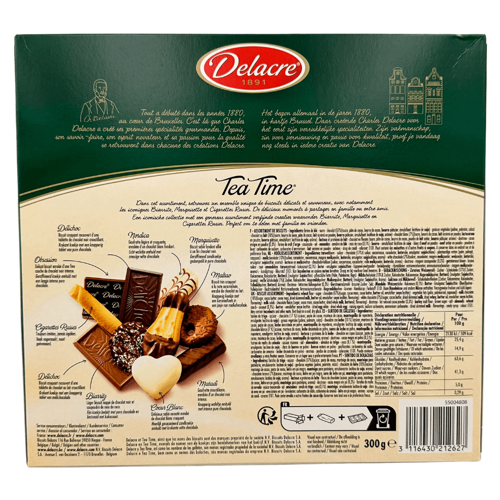 Delacre Tea Time biscuits selection 300g offers a refined assortment of ten different biscuits with classic recipes. This selection includes dark, milk, and white chocolate biscuits, delicate wafer curls, and buttery shortbread, each crafted for a balanced texture and rich flavour. The biscuits display a golden, crisp appearance and are baked to provide a satisfying crunch.