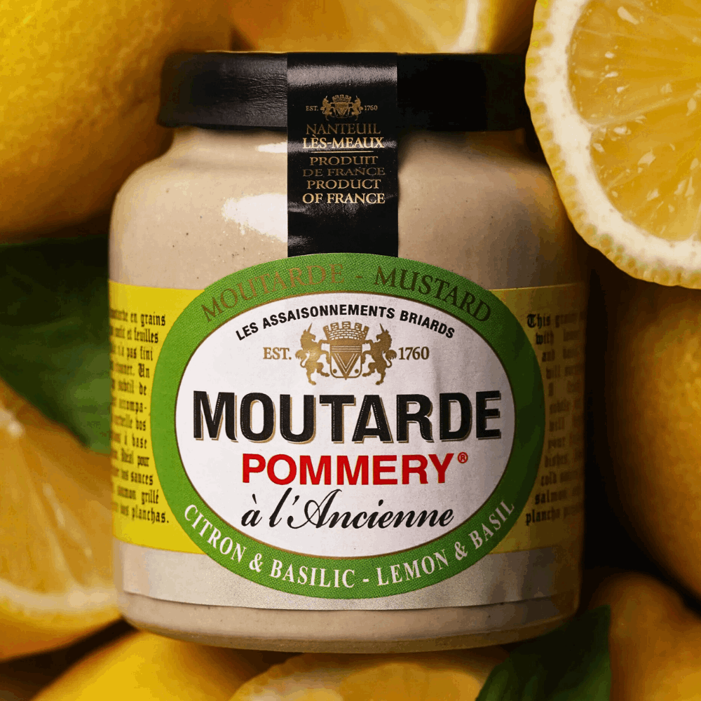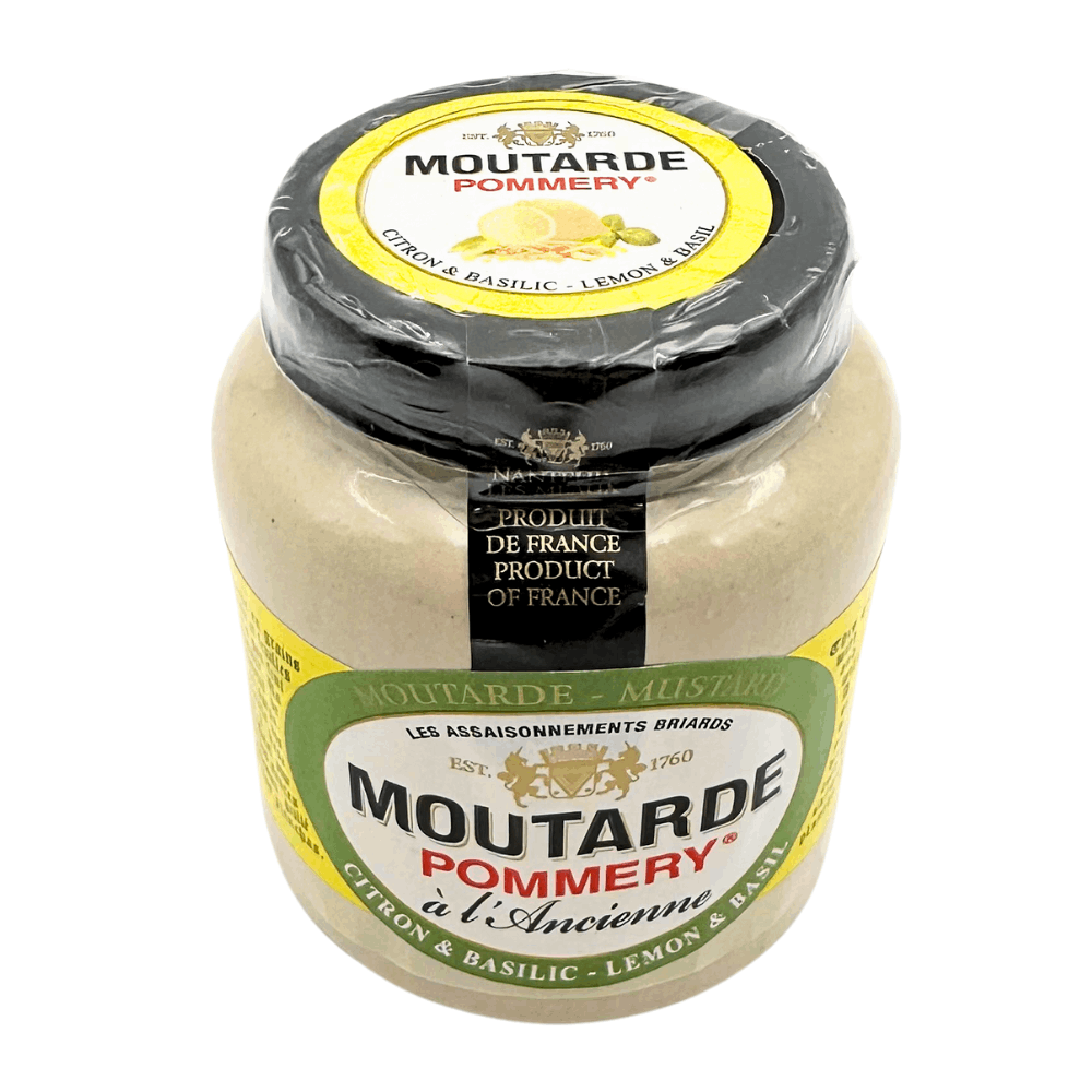 Enhance your culinary creations with Pommery lemon & basil wholegrain mustard 100g, from Meaux, the historic French town renowned since the 18th century for its mustard-making tradition. This wholegrain mustard blends coarse mustard seeds with zesty lemon and fragrant basil, creating a bright, refreshing flavour with a lightly textured, robust consistency. Produced using traditional methods, the mustard seeds are carefully ground and blended to retain their natural depth and complexity, ensuring a high-quality condiment for meats, seafood, salads, and sauces. Try it in dressings, marinades, or as a finishing touch on grilled fish and chicken. Packaged in a 100g stoneware jar with a resealable lid, it stays fresh and ready to use, with an optional Pommery cork top.