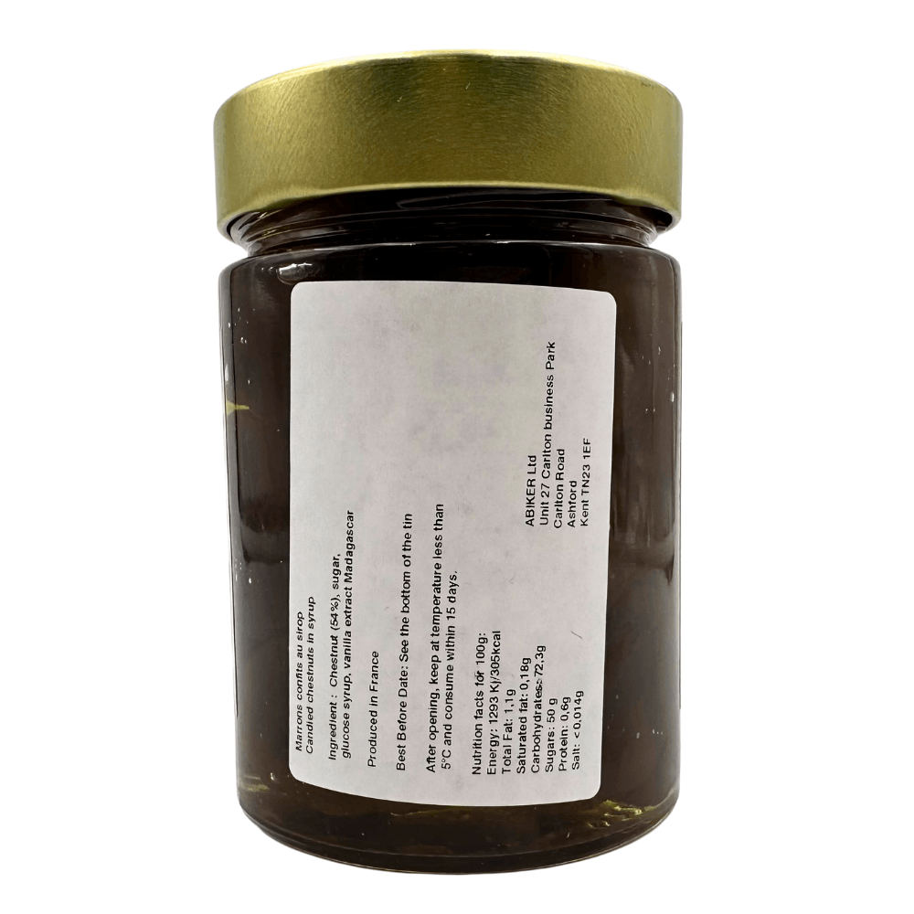Ingredients: Whole chestnuts (54%), sugar, glucose syrup, vanilla essence from Madagascar.